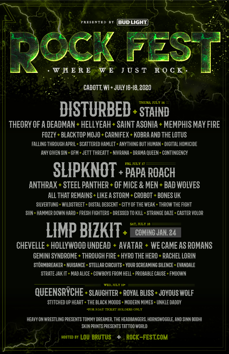 This year may very well be the best lineup in the long history of the festival. It includes Slipknot, Disturbed, Staind, Papa Roach, Limp Bizkit, Theory of A Deadman, Hellyeah, Saint Asonia, Anthrax, Of Mice & Men, Bad Wolves, Chevelle, Hollywood Undead, All That Remains, Like A Storm, Crobot, Bones UK, Avatar, We Came As Romans, Fozzy, Memphis May Fire, Gemini Syndrome, Through Fire, Hyro the Hero, Rachel Lorin, and many more.